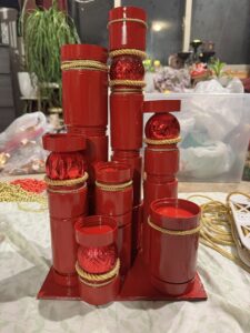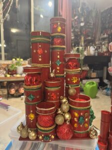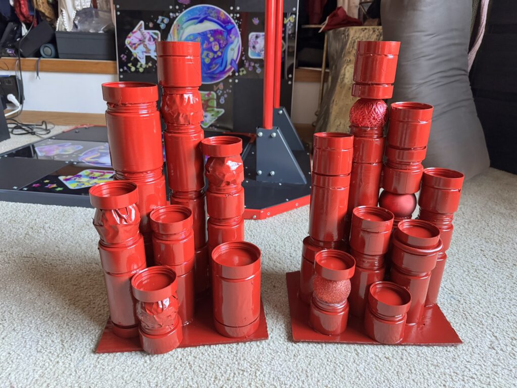 1) Use old jars (I use plastic because it’s lightweight). Cut out cardboard to create a base (also lightweight). Stack plastic jars in fun and interesting ways, being sure to vary height of each. I like to make these up to 1.5 ft tall, because it creates a dramatic look when placed in the living room.