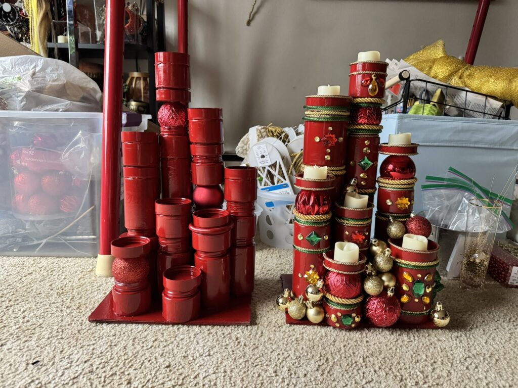 This project turns out so beautiful and is fun to make. Using recycled and reused materials, along with random ropes and trims found at the thrift store, a beautiful candelabra can make a great lively piece for your Holiday decor this year!